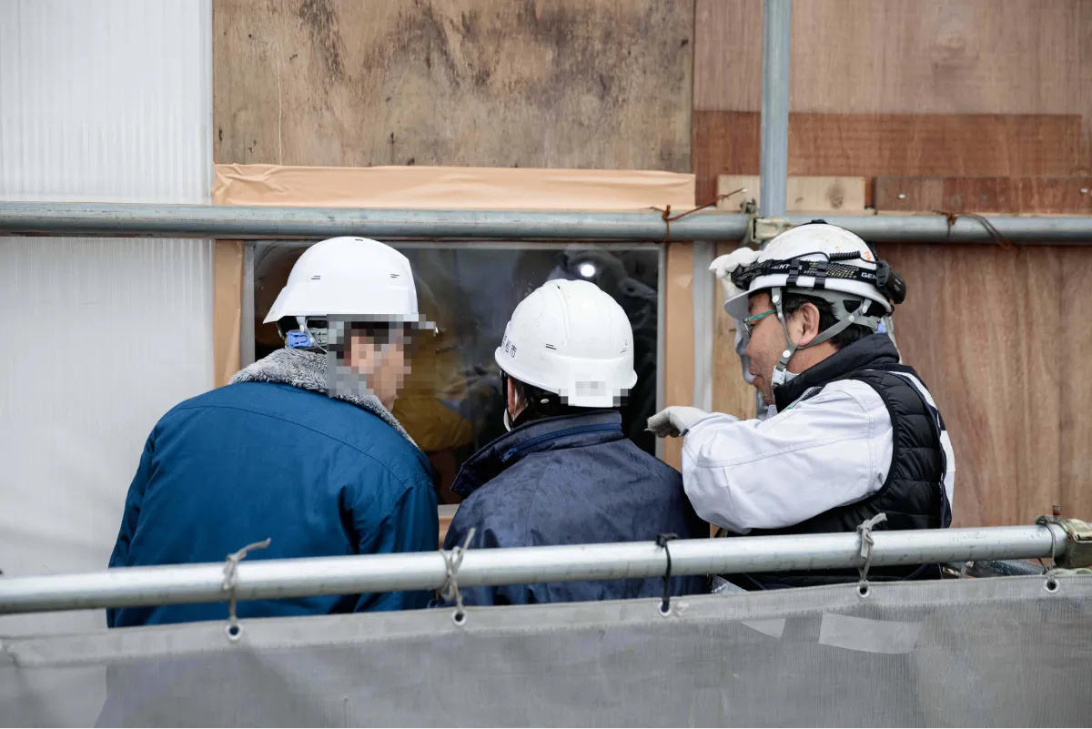 今回初の試みである足場の一部分を透明アクリルボードを貼り、内部の施工状況が確認できる工夫をし、対象者へ見学をしていただきました。