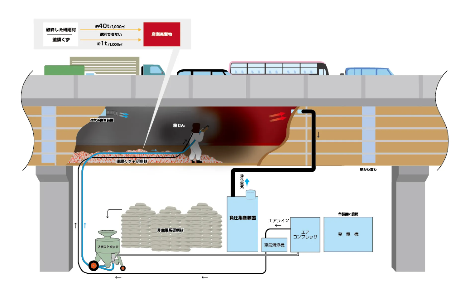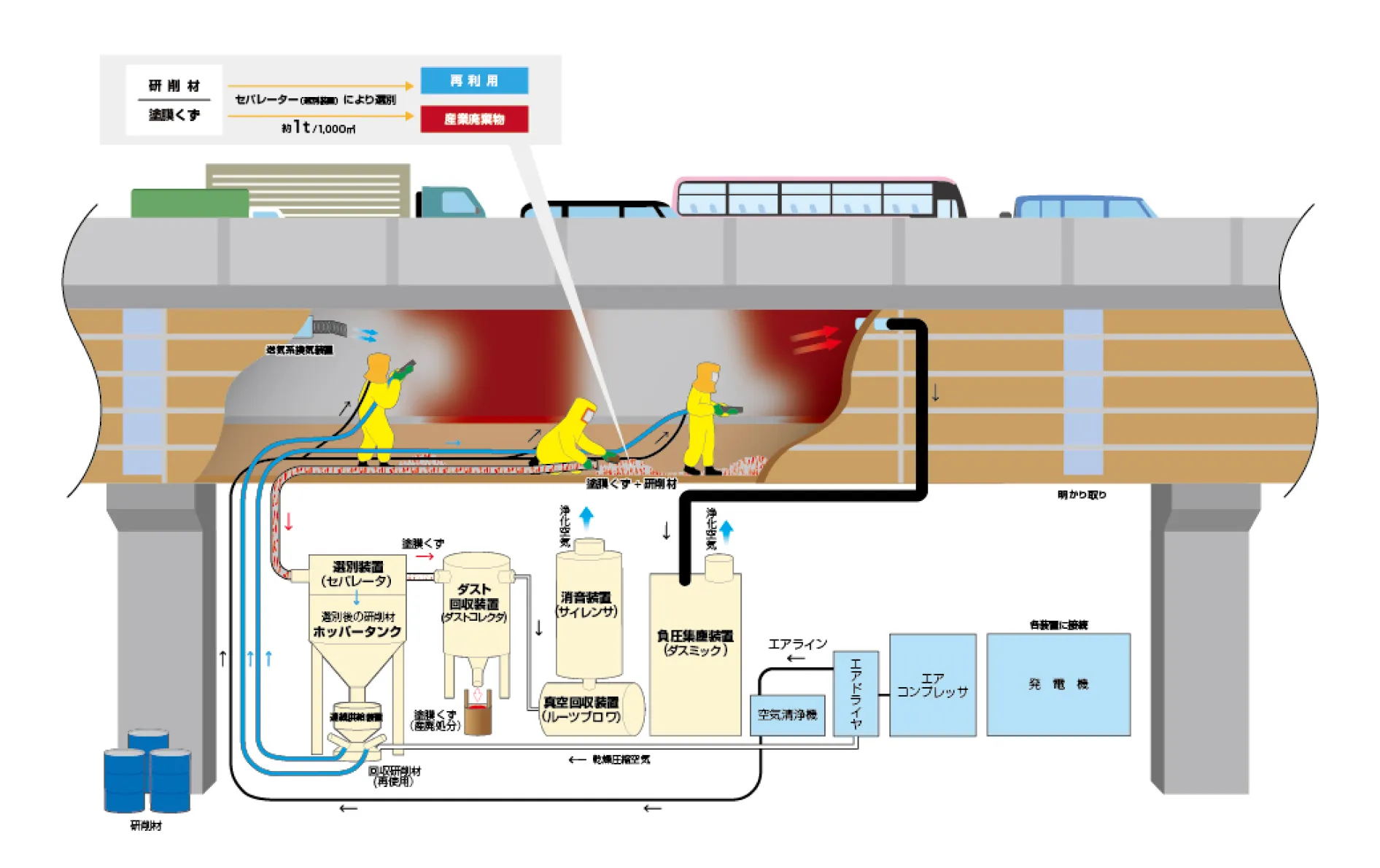 循環式ブラスト工法®︎は、鋼橋等の旧塗膜の除去および素地調整において、ブラストによって剥離させた塗膜くずと使用した研削材を共に回収し、両者を選別したうえで研削材を循環再利用するブラスト工法です。研削材を循環再利用することで、その量に相当する産業廃棄物の発生を抑制し、環境負荷の低減を図ることができます。