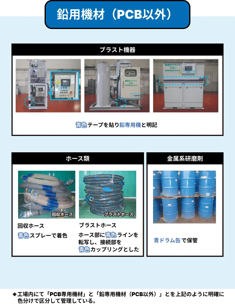 PCB専用機材とPCB以外の鉛用機材とを明確に区別せず作業を行うと、PCB未含有現場も汚染する危険性があります。