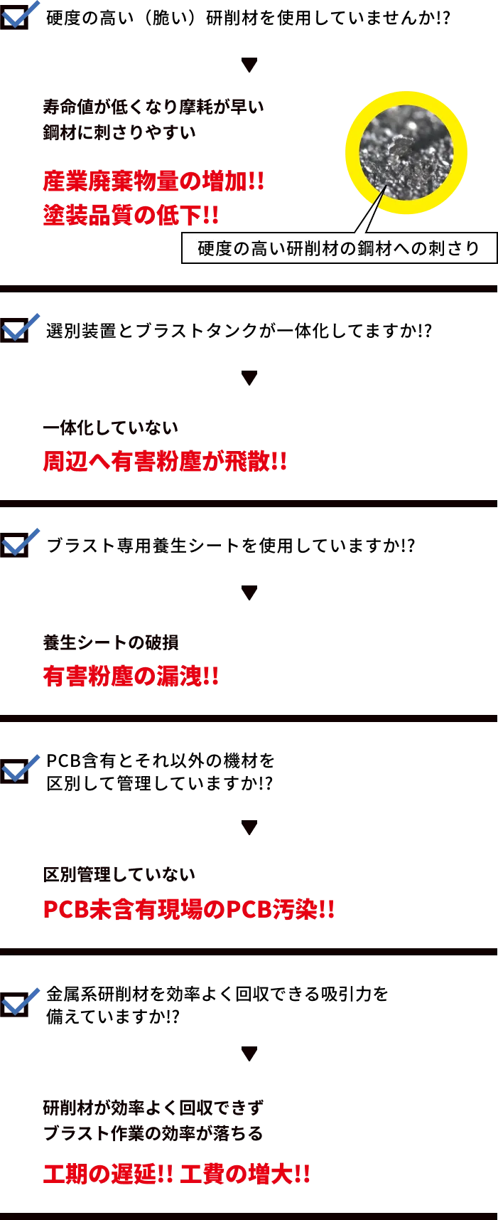 循環式ブラスト工法®に一見似ているものの、安全性や品質面において問題がある類似工法も存在します。当社の工法は厳格な基準に基づいて開発、検証されており、確かな品質を保証します。