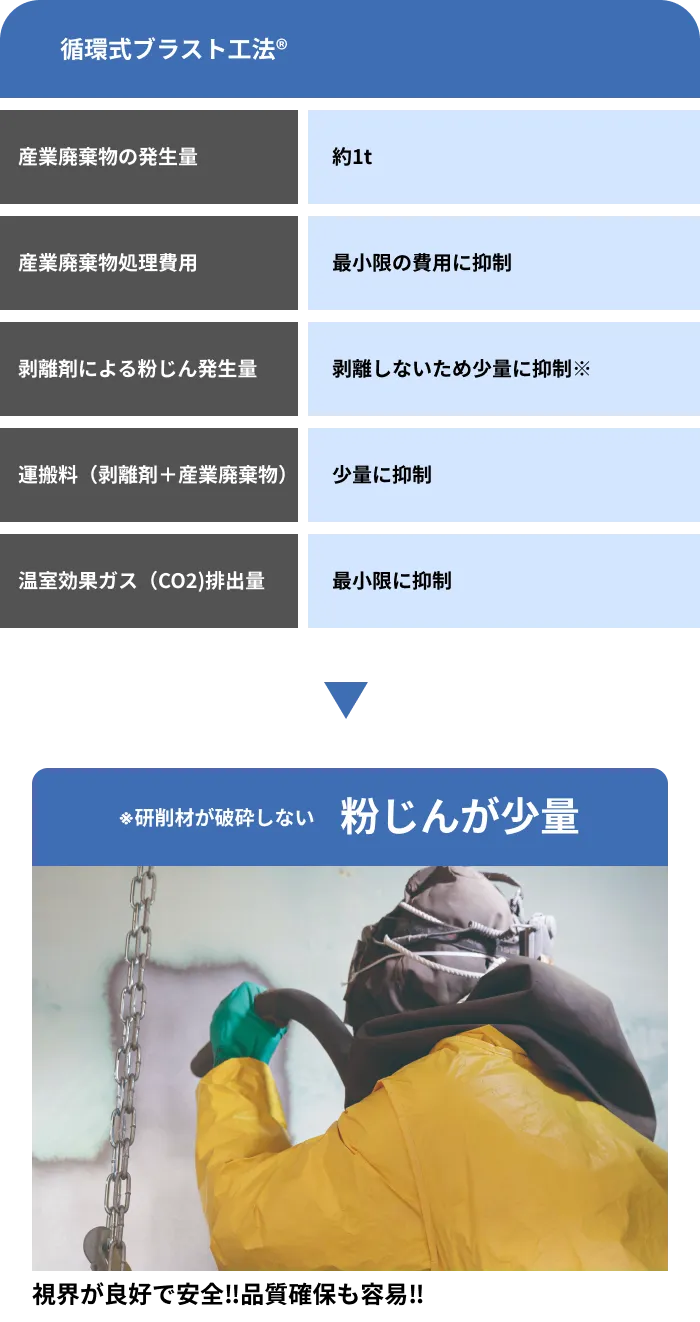 類似工法が乱立する中、循環式ブラスト工法®︎の定義を明確にするため、建設技術審査証明において産業廃棄物の発生抑制効果を、使用する研削材の削減率で確認しています。